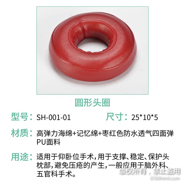 在醫用體位墊系列中,有很多種規格型號的體位墊,那么其中有一款圓形頭圈,不知道大家是否了解過,這在醫用體位墊系列中,它的咨詢人數是較多的,這款圓形頭圈形似環形游泳圈,中間空洞設計,能夠使患者使用時頭骨位置呈現懸空的狀態,保護頭骨突出位置,防止長時間的壓力導致褥瘡的發生。