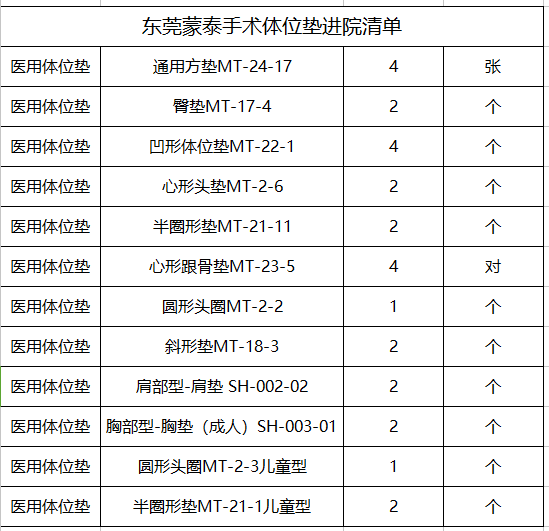 中標(biāo)后,由于疫情的影響,手術(shù)體位墊的款式遲遲沒有確定下來,一直到11月份,終于確定了部份款式先進(jìn)院使用,清單如下: