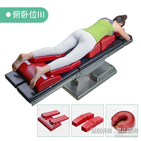 俯臥位海綿體位墊的三套方案有高碗頭圈、胸墊、可調節俯臥位胸墊、髂嵴墊、凹形體位墊、俯臥位腿墊和改良腿墊,高碗頭圈選用高彈力海綿和記憶棉拼接組合,有良好的支撐力與減壓性,便于俯臥呼吸順暢;可調節俯臥位胸墊選用海藻棉,多規格的模塊組合,可根據體型調節使用,保持良好的呼吸循環;改良腿墊由凹形墊和楔形墊組成,可支撐保護雙下肢。